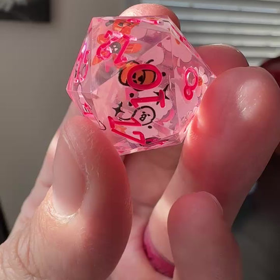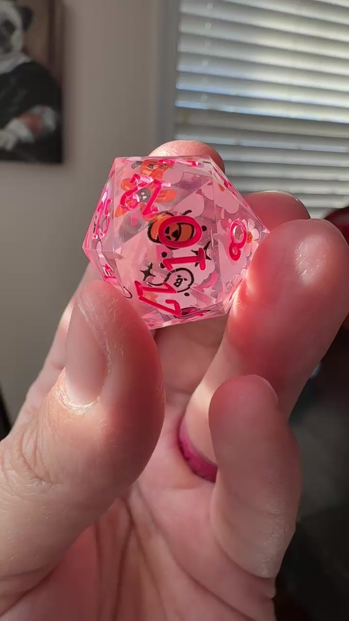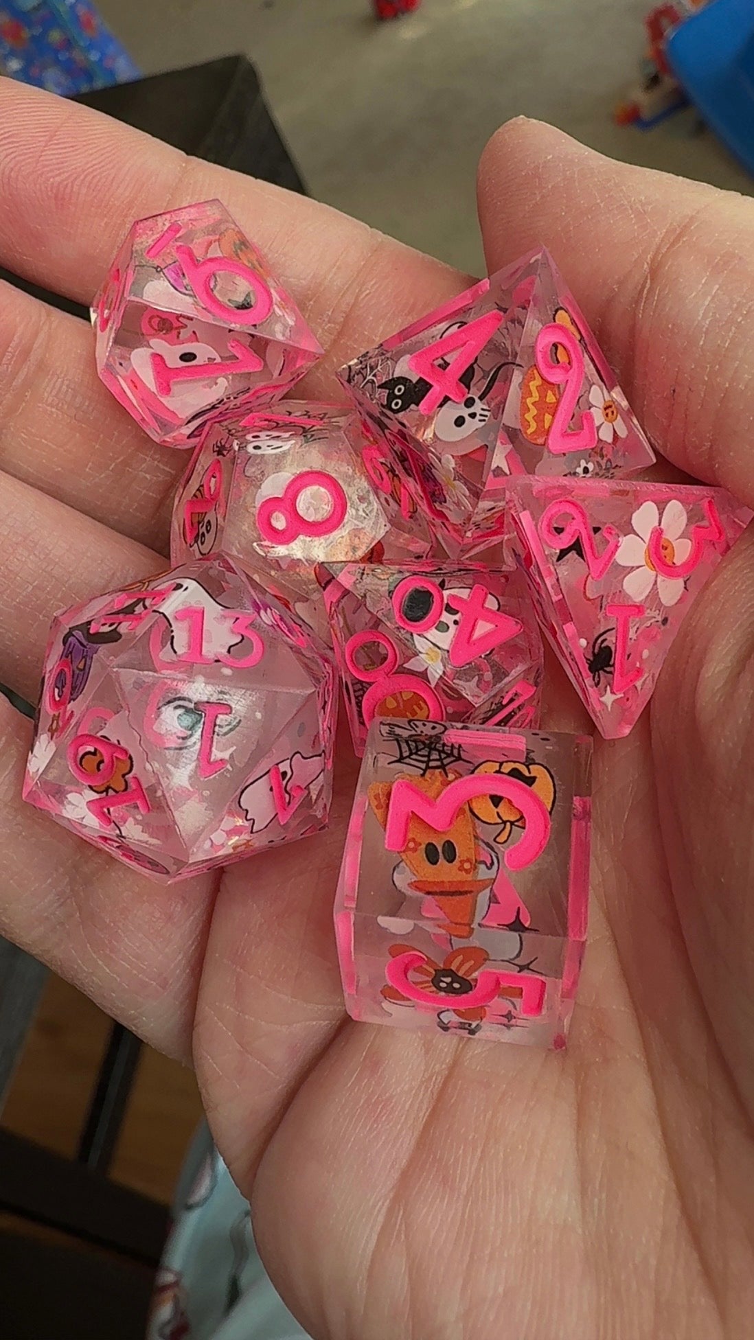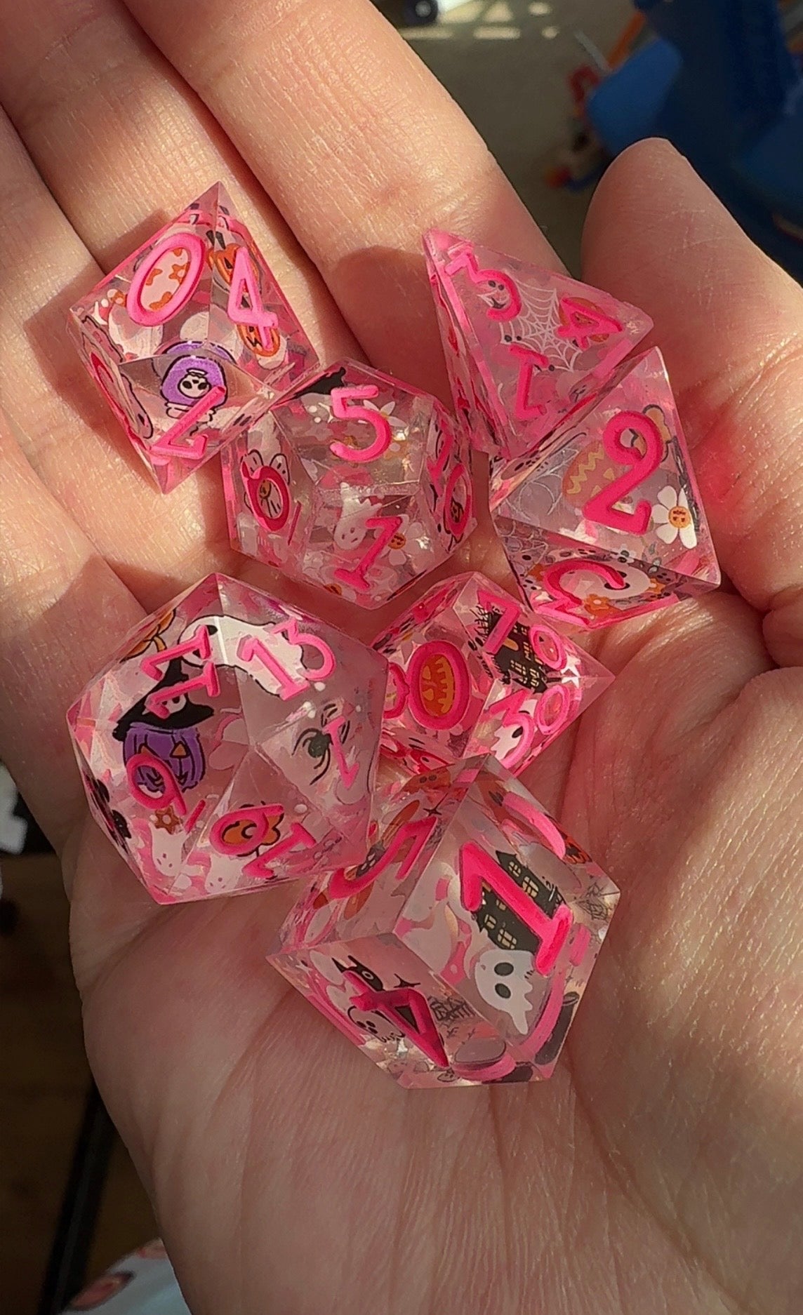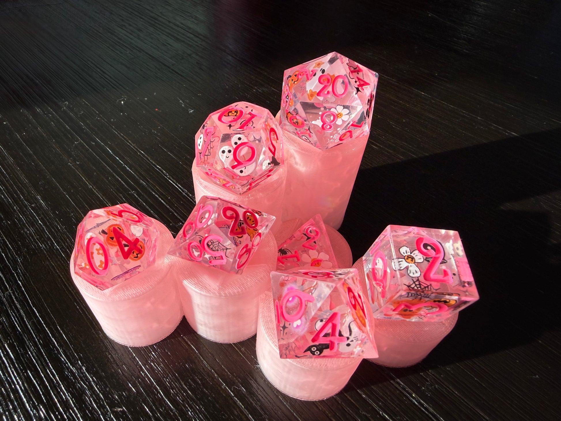 7 piece, hand made, sharp edged dice set. This is a double base die that’s casted clear, taken out and decorated with decals, then casted again in resin for a smooth and clear finish. It is then painted with numbers. Cured in a pressure pot for 24 hours for proper curing time.