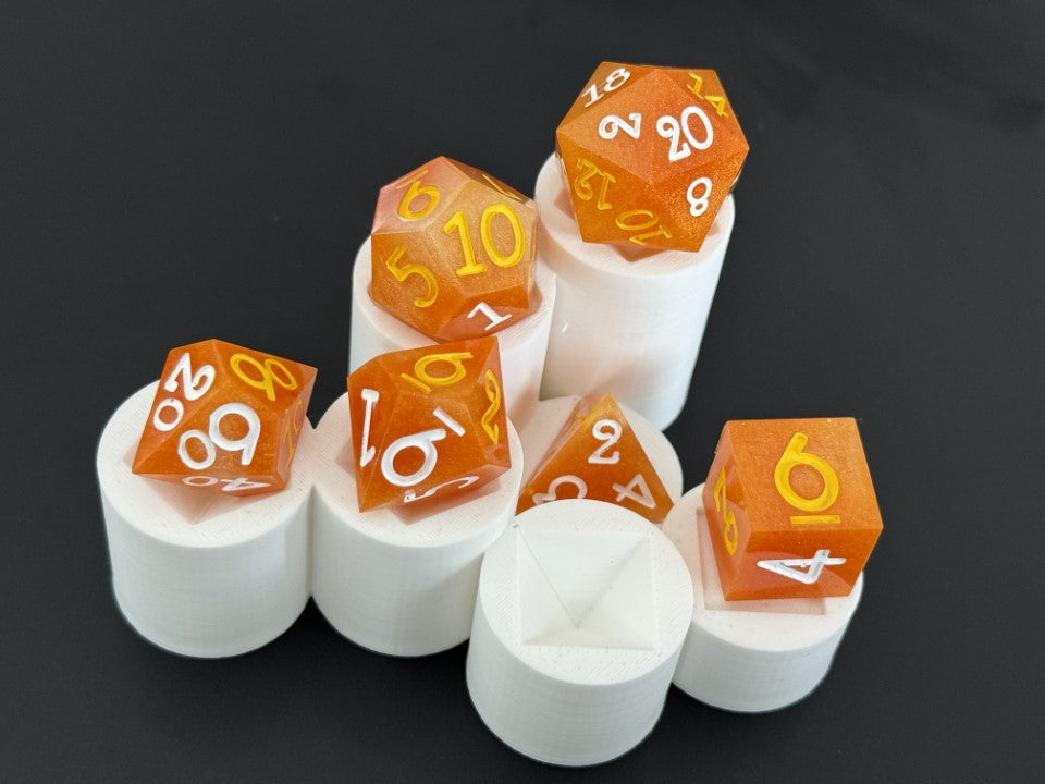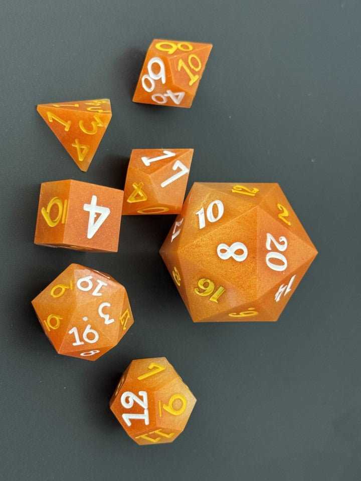 7 piece, hand made, sharp edged dice set. The base is the classic candy corn orange color, with the numbers painted yellow and white to complete the theme. This set also comes with a matching oversized D20! Cured in a pressure pot for 24 hours for proper curing time.