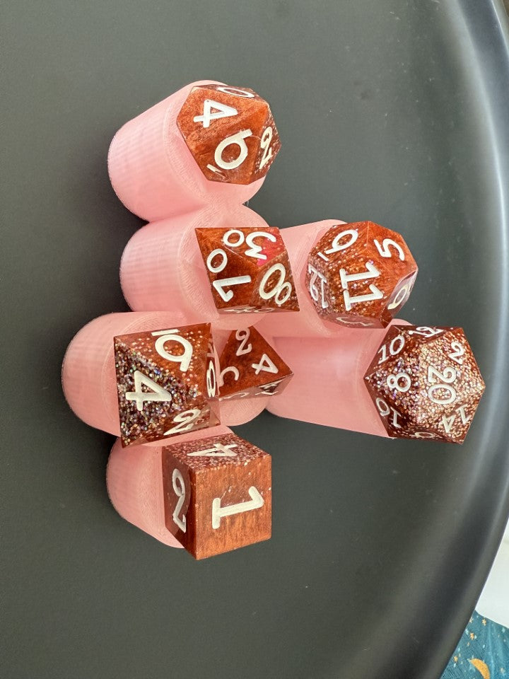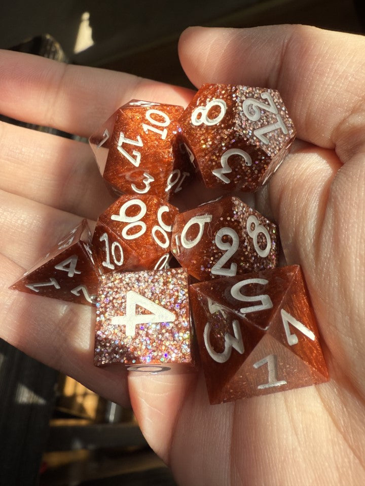 This is a 7pc, sharp edged, dice set. The body of the dice is a shimmery copper color with silver glitter inclusions, and white painted numbers. These are hand poured and cured in a pressure pot for 24 hours for proper cure time.