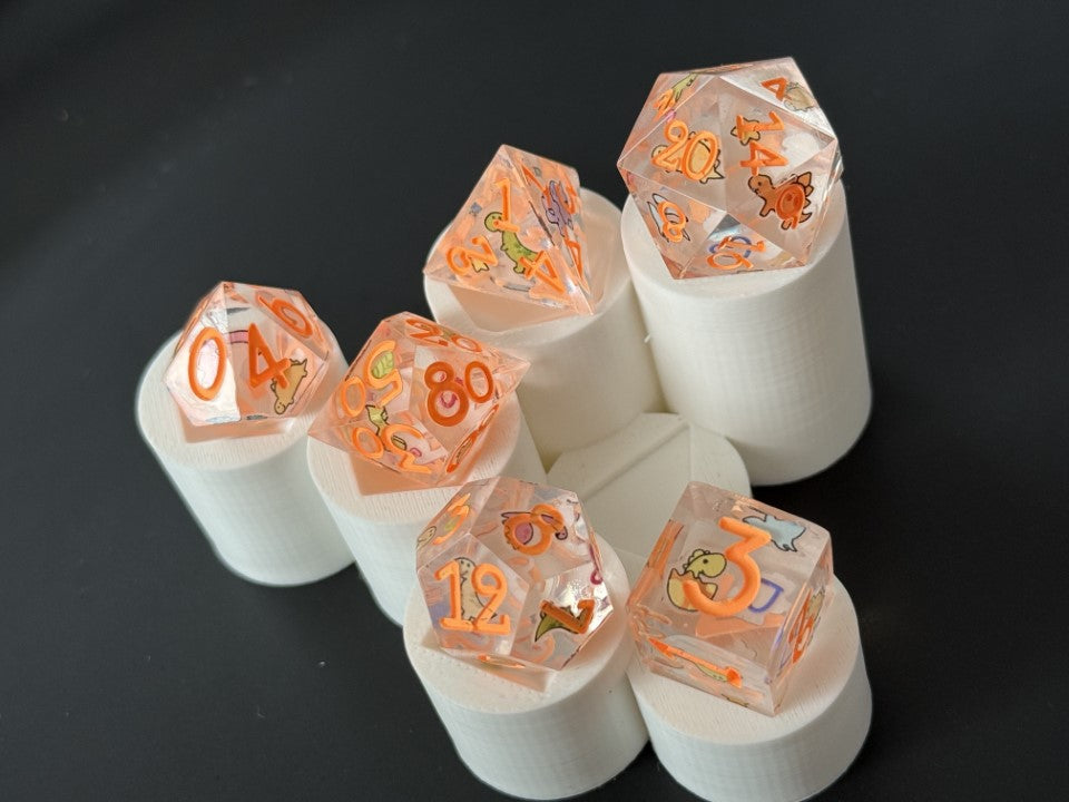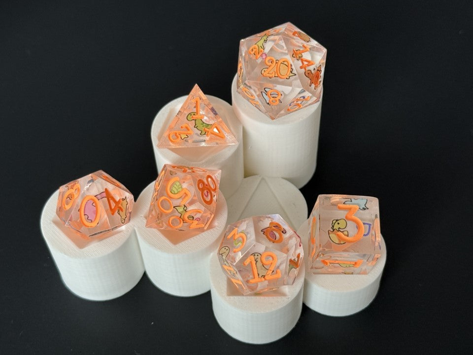 6 piece, hand made, sharp edged dice set. This set is first made with clear dice blanks, decorated with dinosaurs all around the dice, and then casted again in clear resin, to then finish them off with a bright neon orange paint for the numbers. Cured in a pressure pot for 24 hour for proper curing time