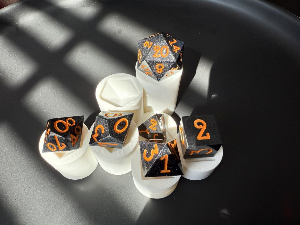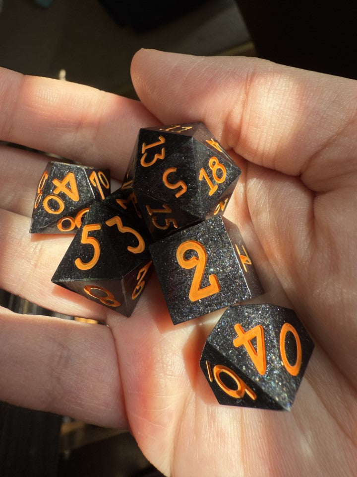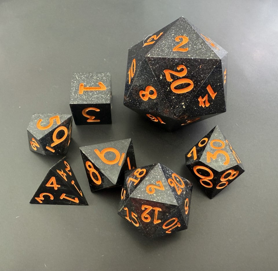 7 piece, hand made, sharp edged dice set. The base is made up of a black mica powder that has yellow and blue shimmer throughout. The numbers are painted orange for the theme. This set also comes with a matching oversized D20. Cured in a pressure pot for 24 hours for proper curing time.