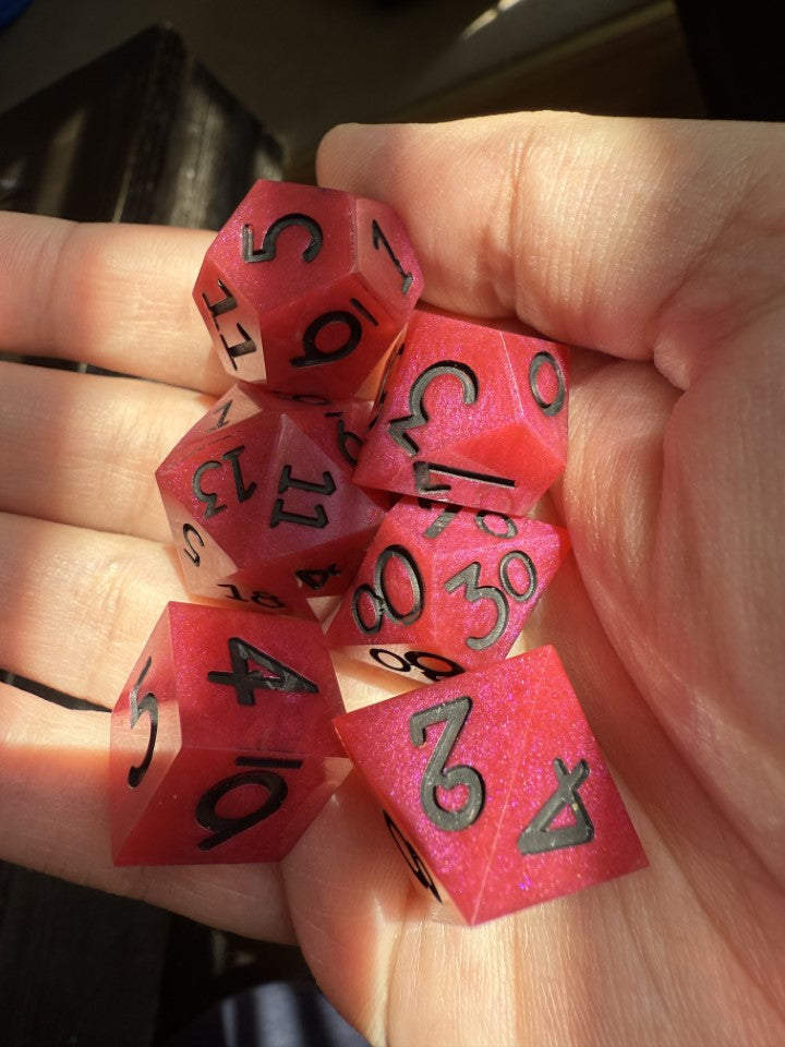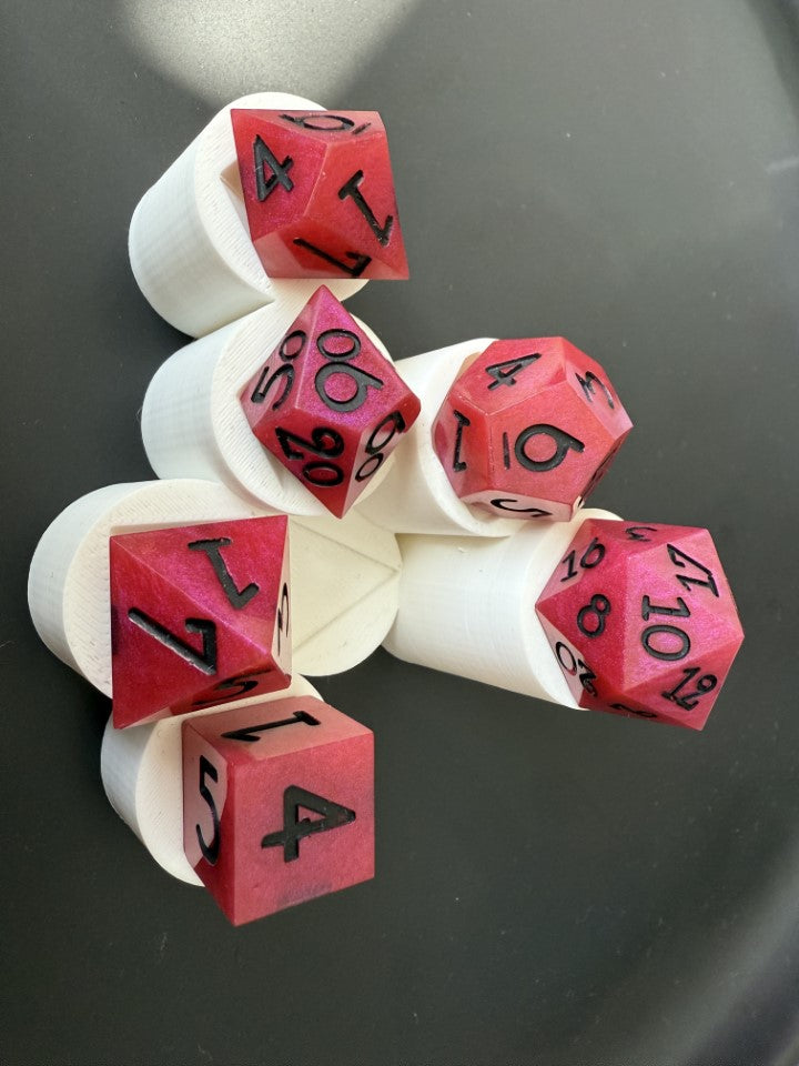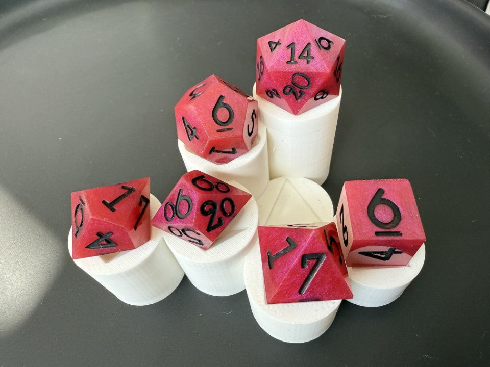 6 piece, hand made, sharp edged dice set. The base is made up of a pretty magenta color with black painted numbers. Cured in a pressure pot for 24 hours for proper curing time.