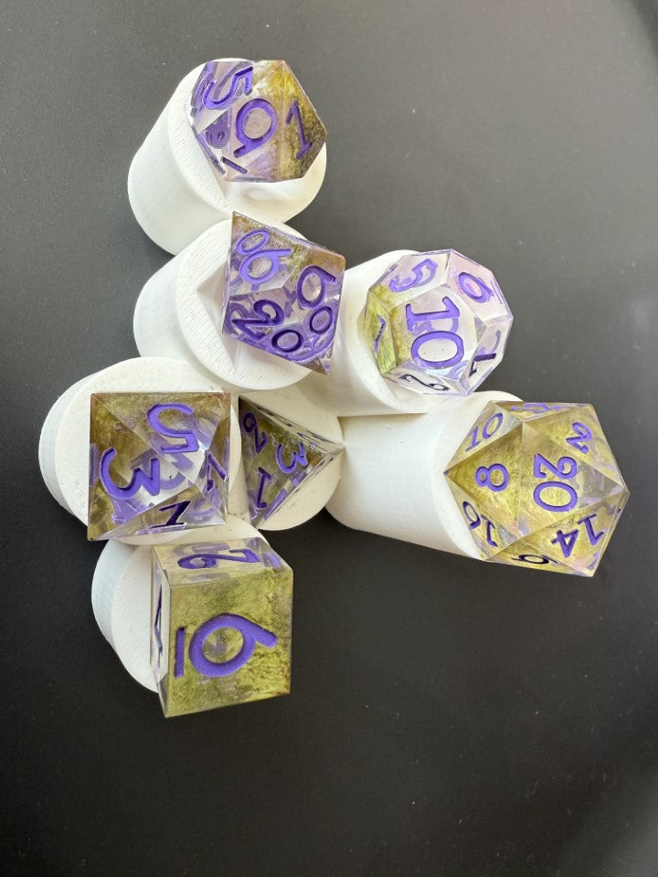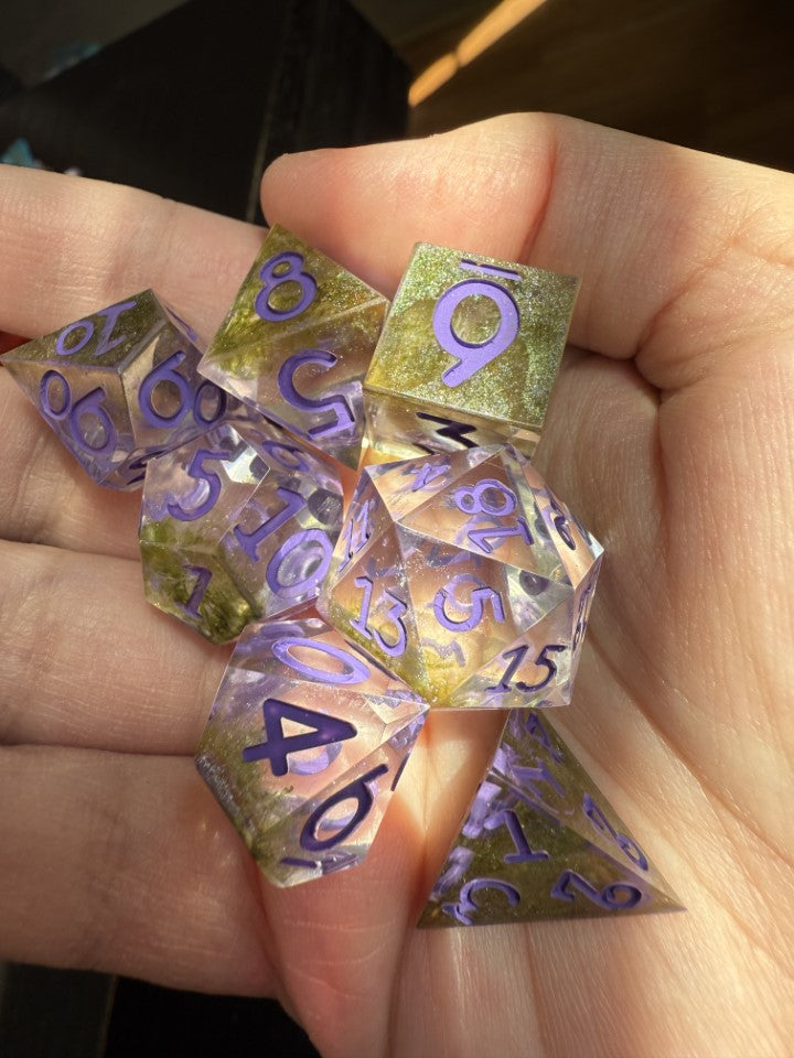 These are a 7 piece, sharp edged, dice set. The body of the dice was made with a clear resin, and paired with shimmery green/mossy colored alcohol ink. The numbers are painted purple for a contrast of color. These are hand poured and cured for 24 hours in a pressure pot for proper cure time.