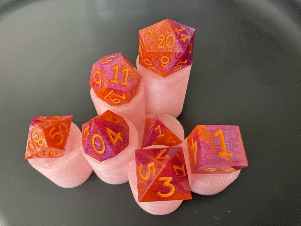 7 piece, hand made, sharp edged dice set. The base is a mix of purple and orange resins, with a lighter orange for the numbers. Cured in a pressure pot for 24 hour for proper curing time.