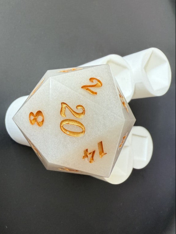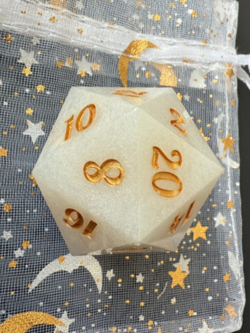 Single oversized D20, hand made, sharp edged dice. The base is made up of a pearly angelic white Mica powder, with gold painted numbers. Cured in a pressure pot for 24 hours for proper curing time.