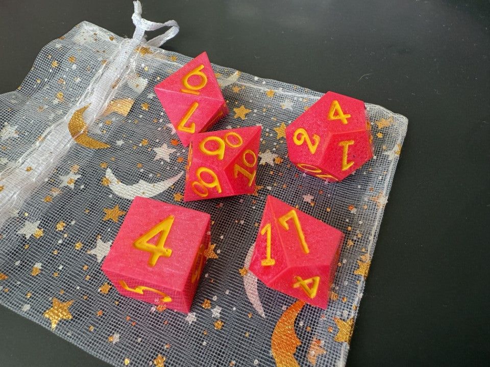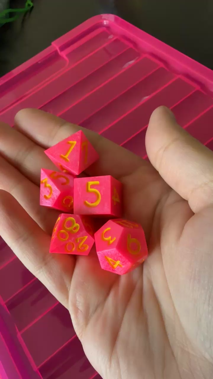 This is a hand poured, 5 piece, dice set. The body is a deep bubblegum pink color and it's paired with a lemon yellow paint to bring together the 'pink lemonade' theme. These are handmade and cured in a pressure pot for 24 hours for proper cure time.