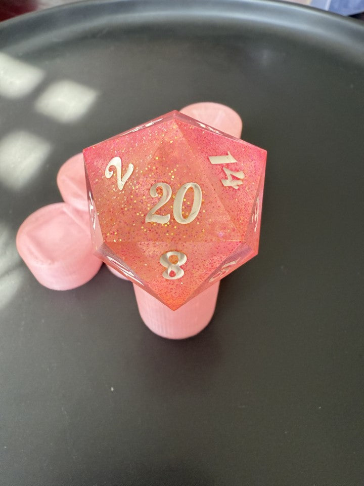 This is a sharp edged, hand poured, single oversized D20. The base is a clear resin with pink and yellow glitters around the outside to give the pink lemonade effects, with white painted number to not take away from the glitter in the dice. This was handmade and cured in a pressure pot for 24 hours for proper cure time.