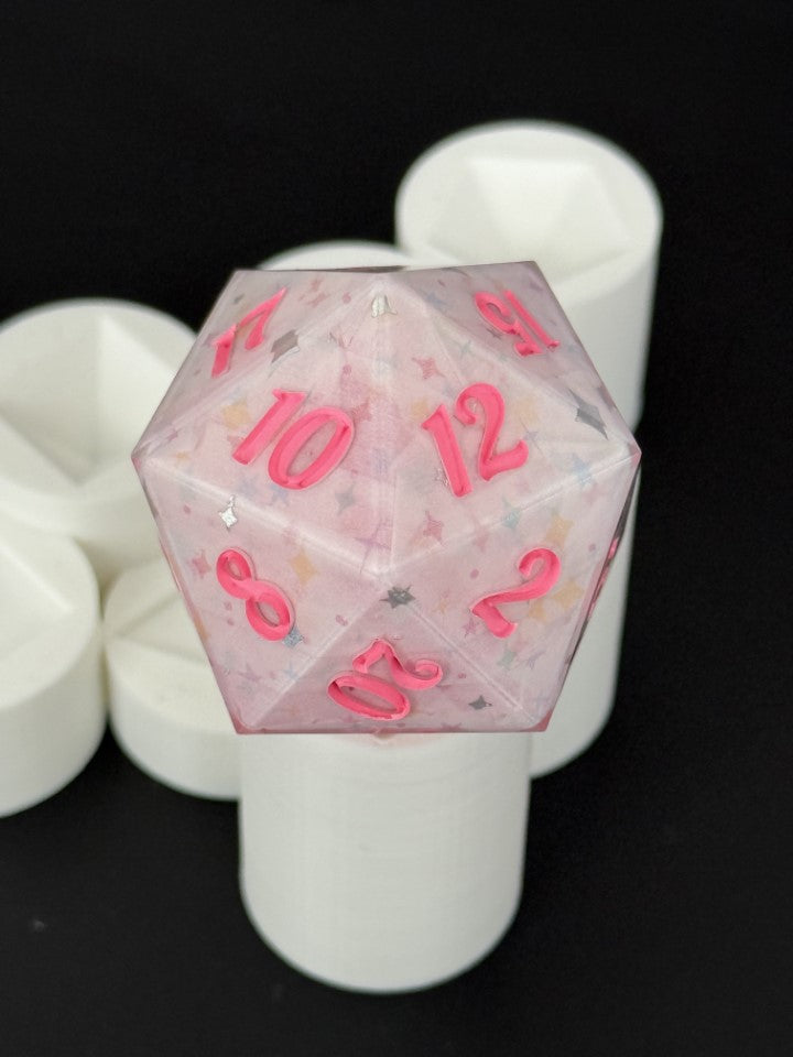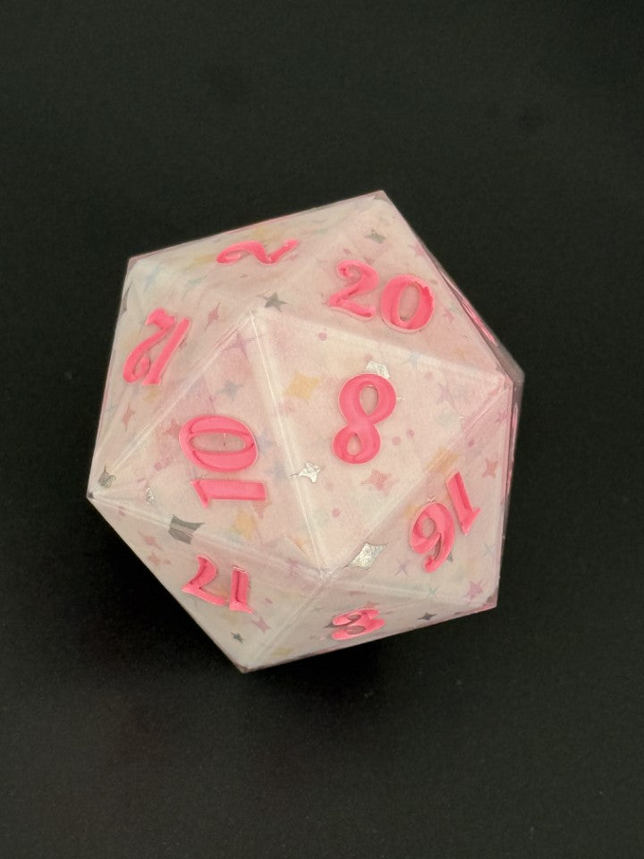 Single Oversized D20, hand made, sharp edged dice. The base is made with a dice blank covered in washi tape, then casted again in clear resin. The numbers are painted a darker pink to compliment the pink core of the dice. Cured in a pressure pot for 24 hours for proper curing time.