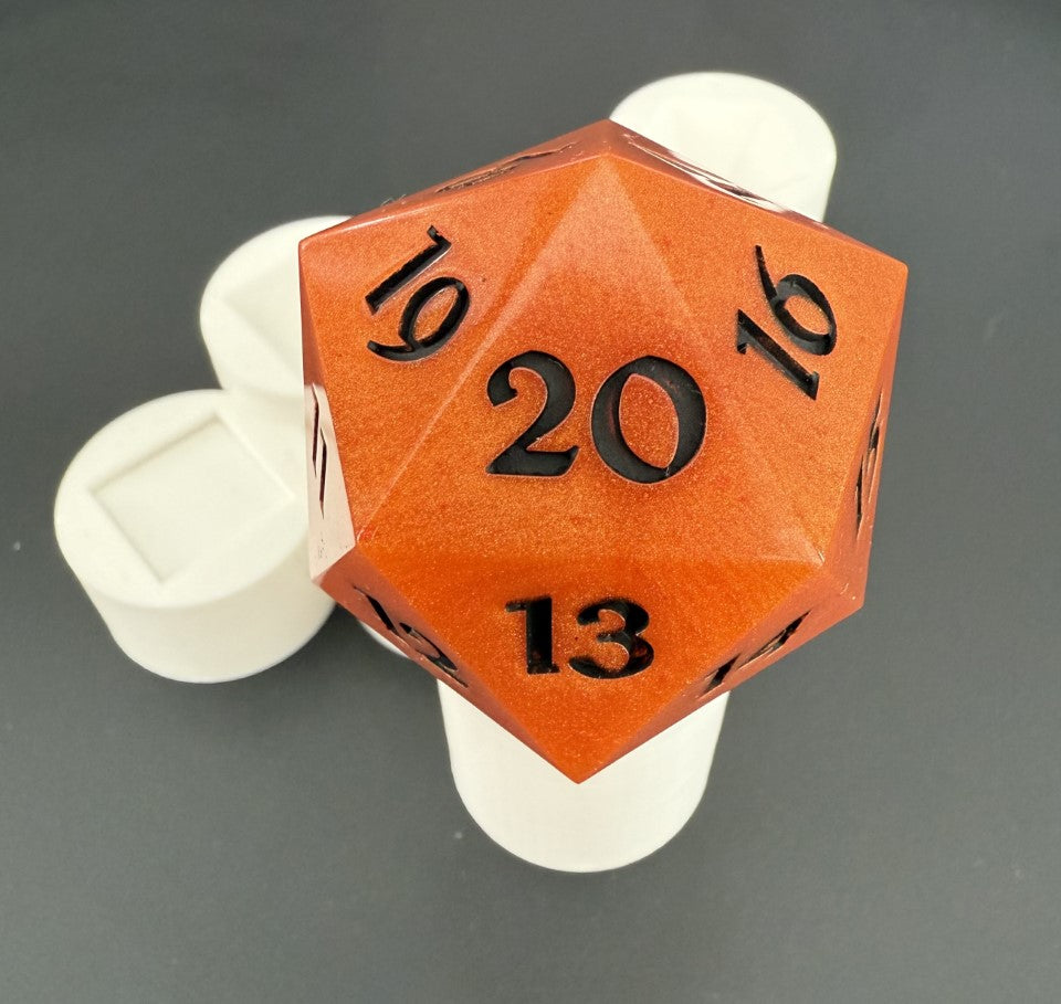 8 piece, hand made, sharp edged dice set. The base is a shimmery Orange with classic black for the numbers. This set also comes with a matching oversized D20. Cured in a pressure pot for 24 hours for proper curing time.