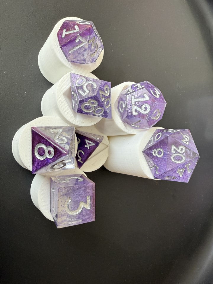 This is a 7 piece, sharp edged, dice set. The body is made with a clear resin and drops of purple alcohol ink throughout, complete with silver painted numbers. These are hand poured and cured in a pressure pot for 24 hours for proper cure time.