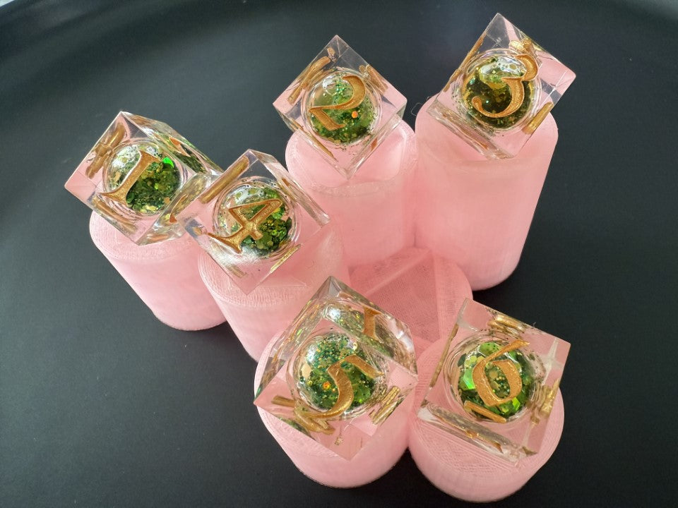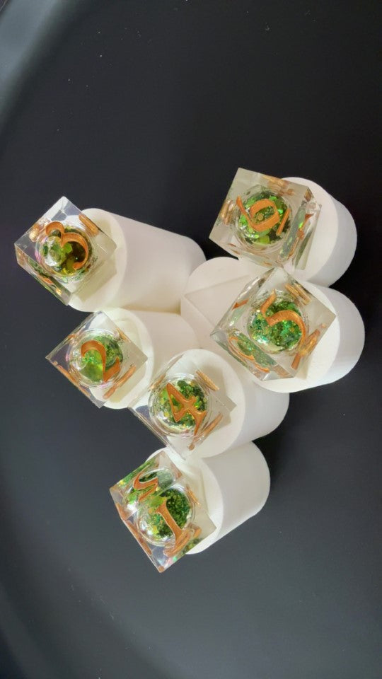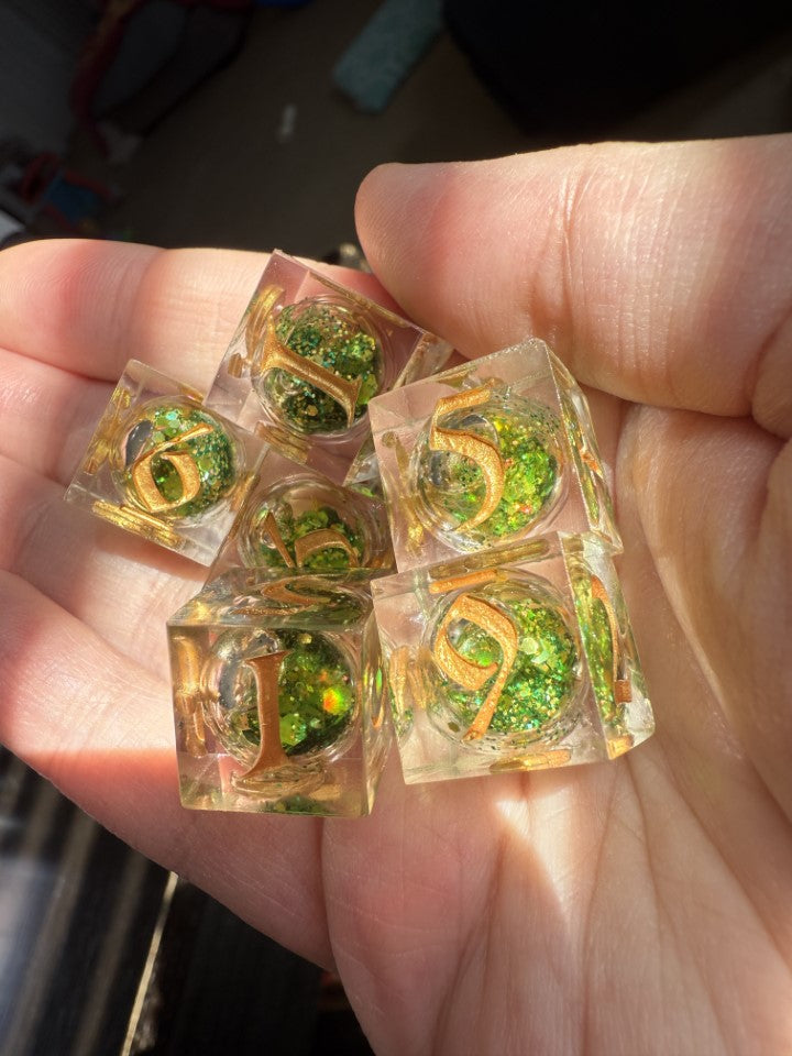 This set is a 6 piece, hand made, liquid core, sharp edged, ONLY D6's, dice set. The liquid core is made up of a mossy green glitter mix, with the rest of the dice being made of clear resin. The numbers are painted gold to really make them pop but to also mix in with the gold shine inside the liquid core. Cured in a pressure pot for 24 hour for proper curing time