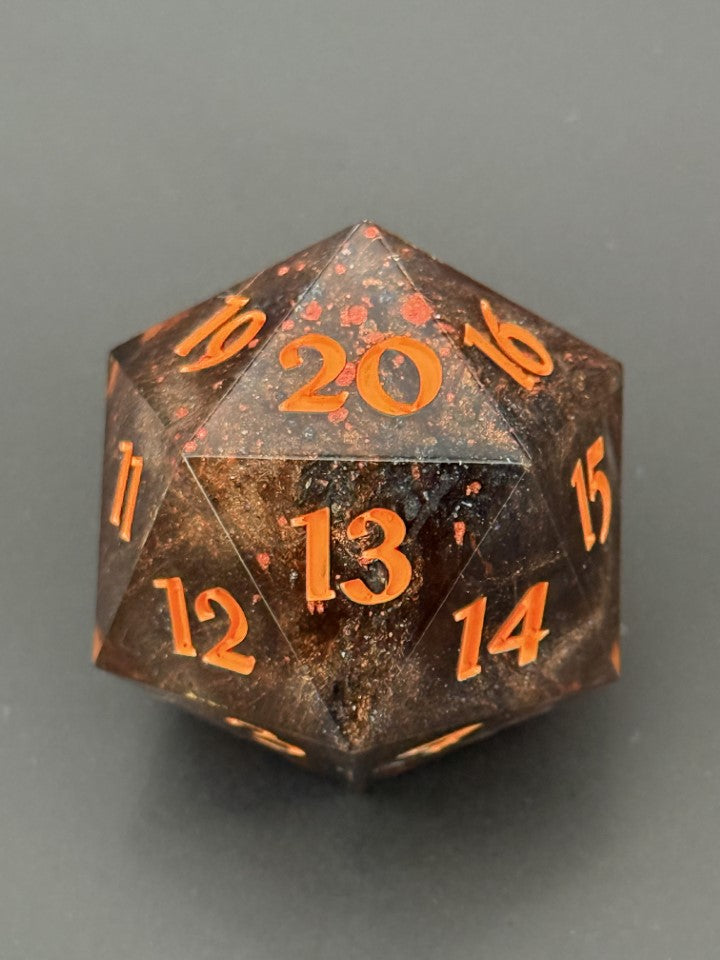 Single oversized D20, hand made, sharp edged dice. The base is made up of a clear resin, with black and orange mica powders swirled throughout to create the 'galaxy' effect. The numbers are then painted orange to tie into the spooky vibes. Cured in a pressure pot for 24 hour for proper curing time